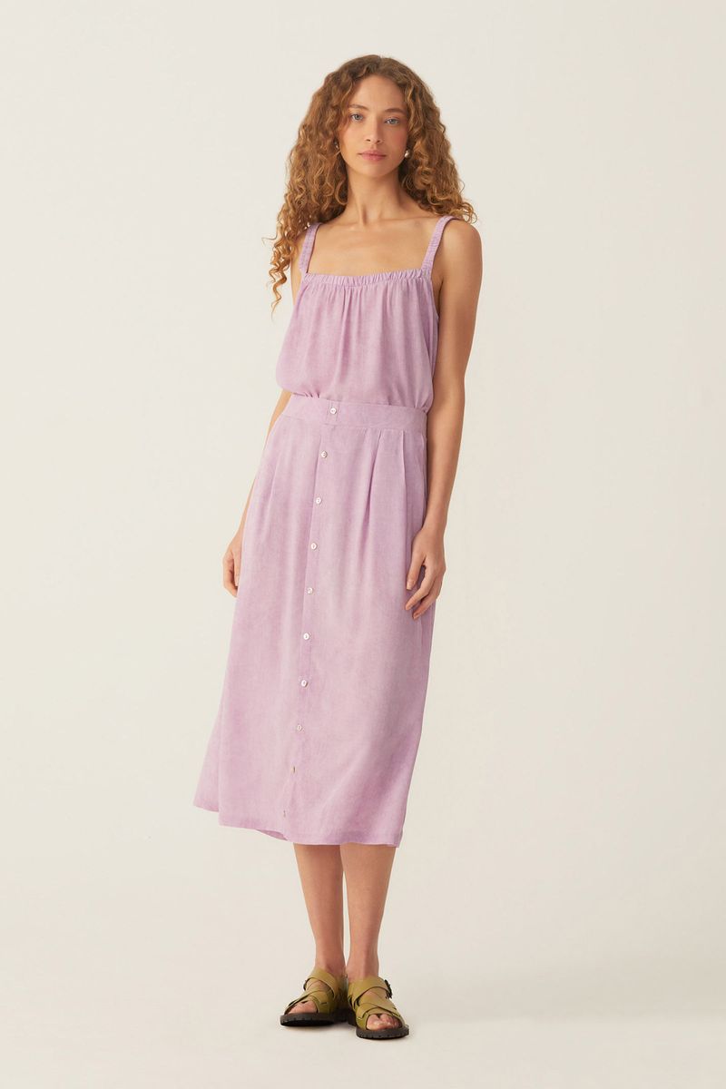 Saia confeccionada em tecido plano de viscose. Leve e fluído, com modelo de comprimento midi. Cós frente entretelado e cós costas com elástico embutido. Pregas frontais e franzido nas costas. Vista com fechamento em botões de madrepérola, parcialmente funcional a partir do 7º botão. Bolsos laterais.