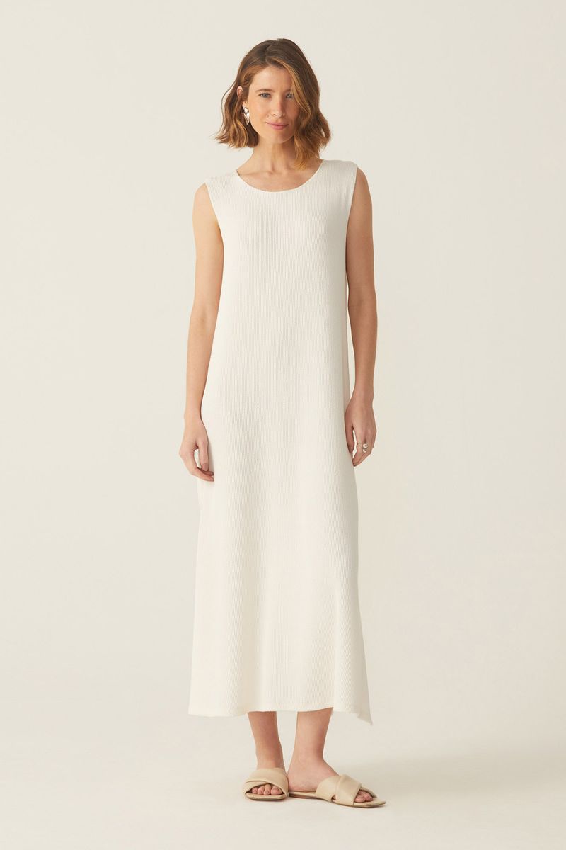 Vestido em malha canelada texturizada de viscose com elastano, proporcionando frescor, fluidez e excelente caimento. Modelo regata, solto ao corpo, com decote U e aberturas laterais.