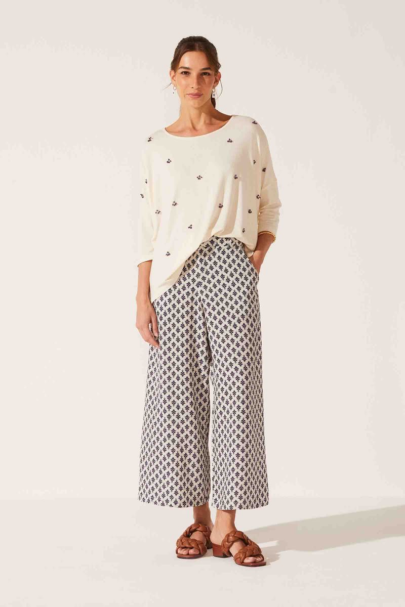Calça confeccionada em tecido plano de viscose com linho, com estampa exclusiva Yogini. Ótimo caimento, toque suave e agradável. Modelo pantacourt. Cós frente liso e cós costas com elástico embutido. Fechamento com zíper de metal e botão de madeira. Passantes, bolsos faca e bolsos aplicados nas costas.
