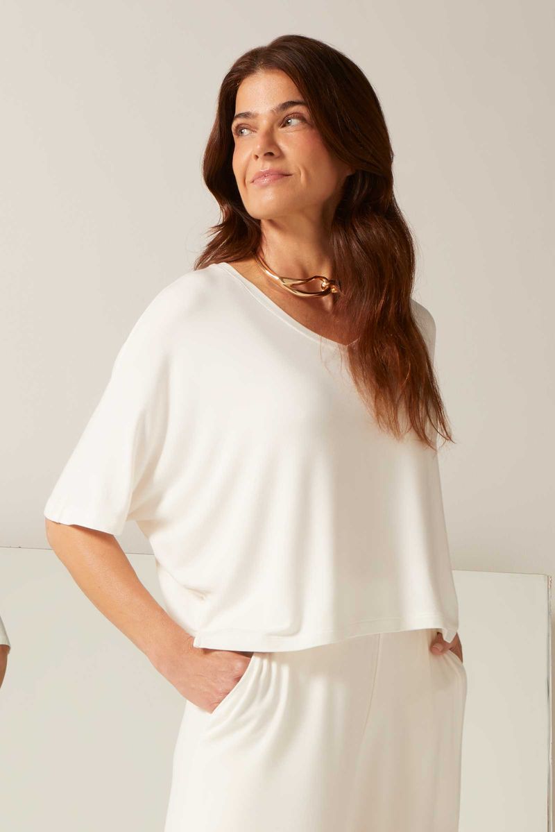 Blusa confeccionada em viscose de Bambu, DNA da Yogini. Roupa que respira, abraça, acolhe, refresca e aquece. Apresenta toque suave e delicado, respeitando a forma do seu corpo e unindo conforto com caimento. Modelo solto, com decote V, mangas curtas e aberturas laterais.