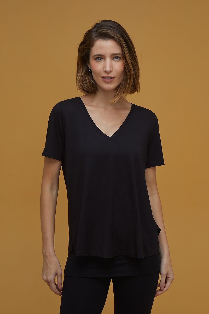 Blusa confeccionada em malha mescla, com toque suave e agradável que proporciona conforto, leveza e ótimo caimento. Modelo ajustado ao corpo, com decote V e mangas curtas.