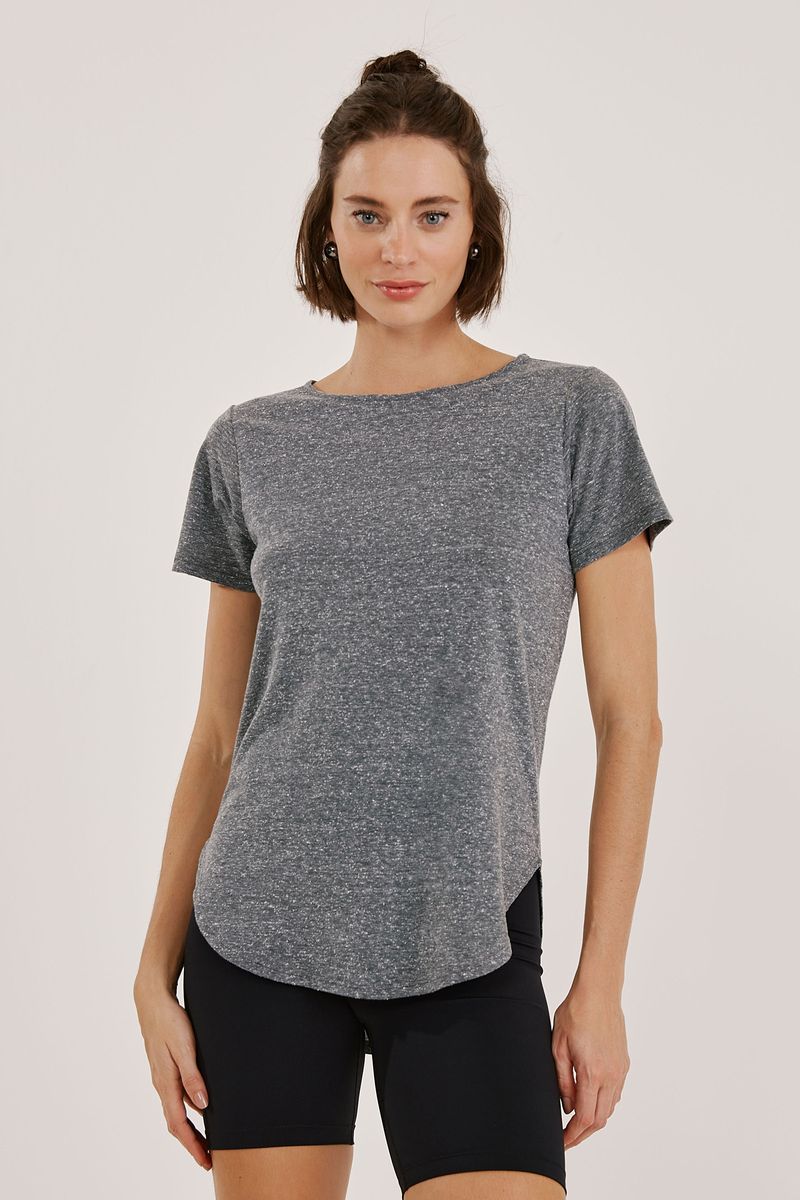em malha reciclada. Este tecido sustentável utiliza matéria-prima que seria descartada, sem necessidade de água, corantes ou produtos químicos em sua produção. Modelo alongado, com decote redondo, mangas curtas e barra arredondada na frente e nas costas.