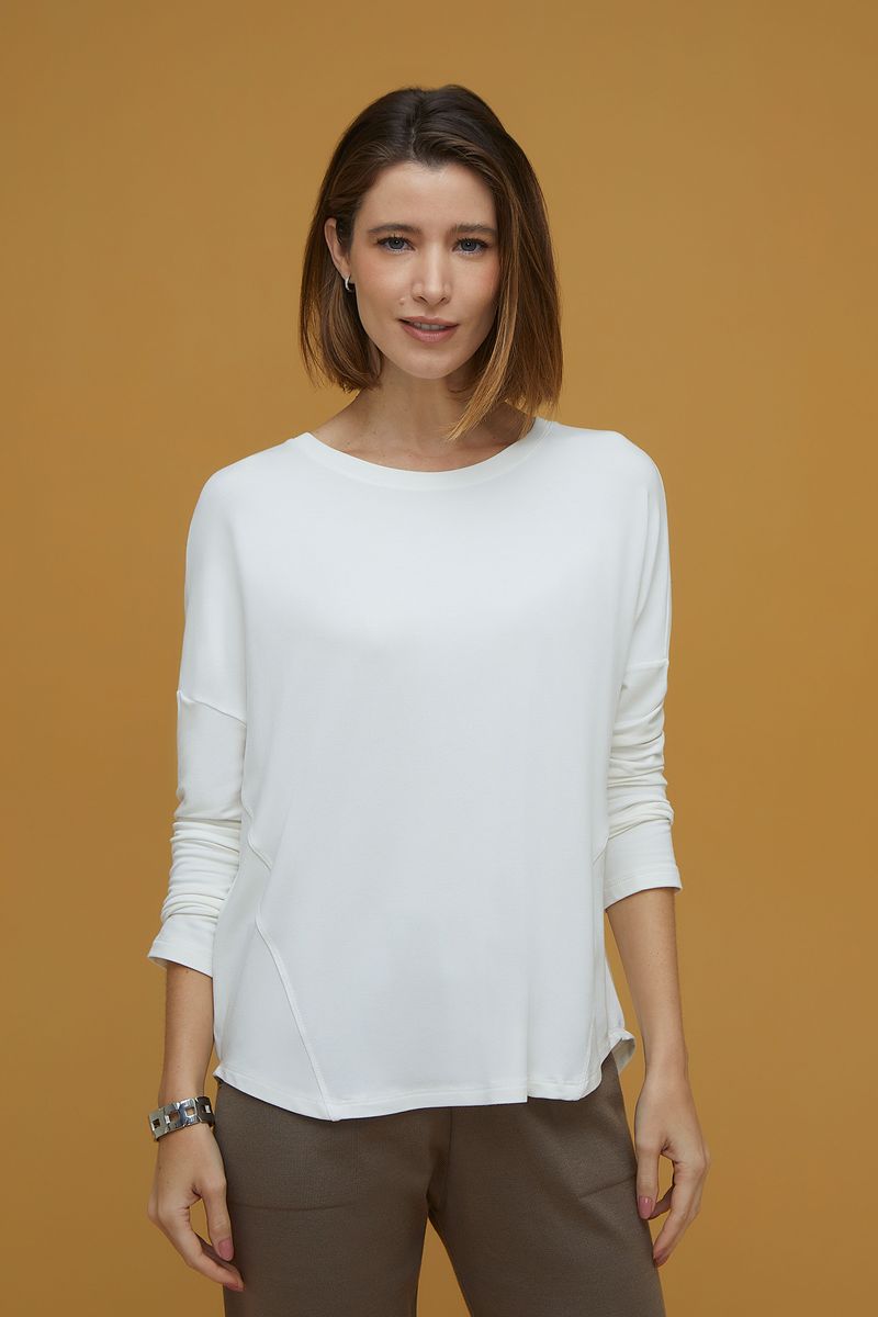 Roupa que respira, abraça, acolhe, refresca e aquece. Apresenta toque suave e delicado, respeitando a forma do seu corpo e unindo conforto com caimento. Modelo solto ao corpo, com decote redondo, cavas deslocadas, mangas longas e barra arredondada, com comprimento das costas mais longo que a frente.