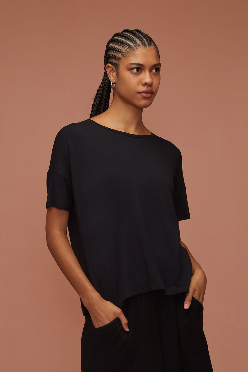 Roupa que respira, abraça, acolhe, refresca e aquece. Apresenta toque suave e delicado, respeitando a forma do seu corpo e unindo conforto com caimento. Modelo solto, com decote redondo e mangas curtas com cavas levemente deslocadas.