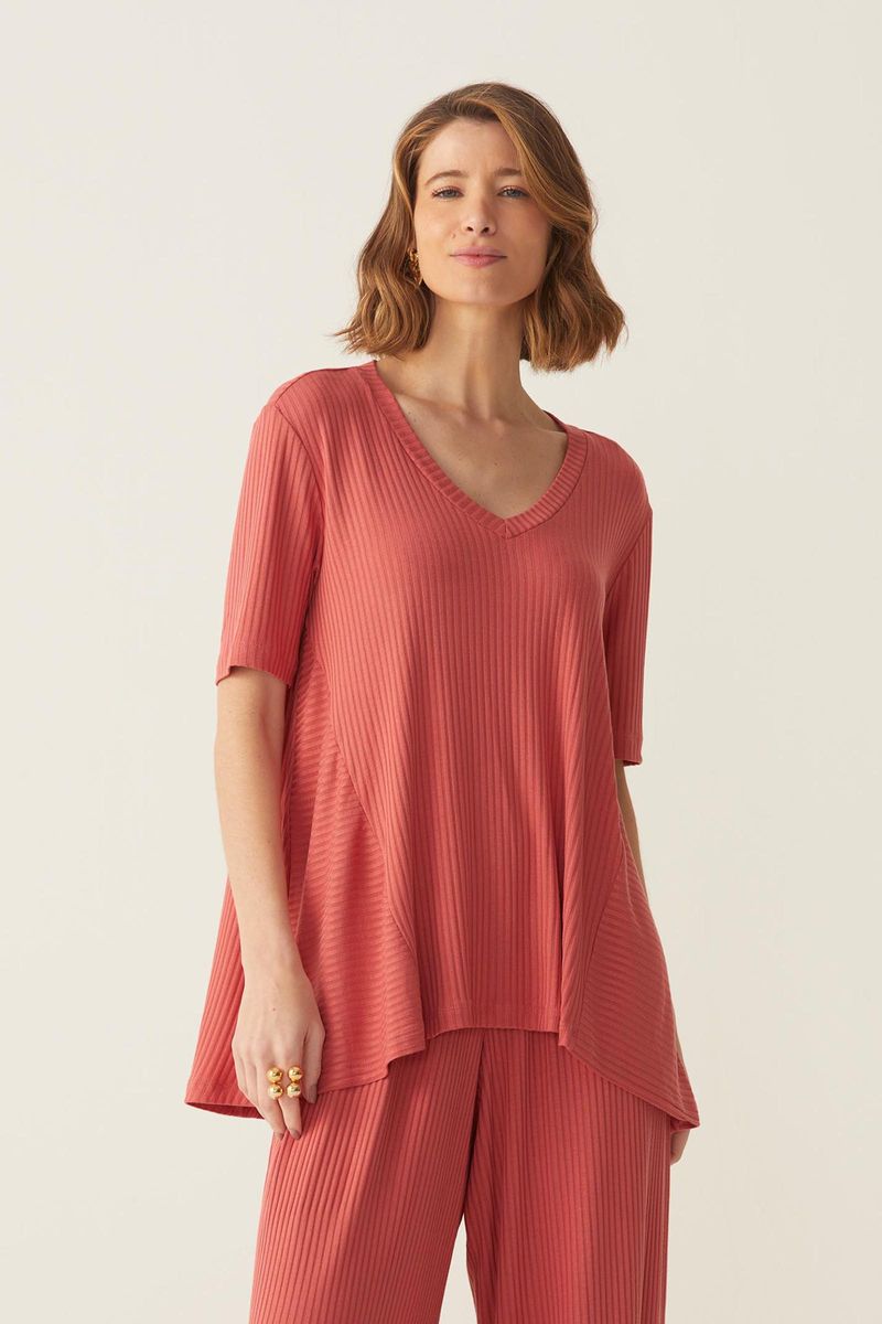 Blusa confeccionada em malha canelada de viscose com elastano, que proporciona a fluidez e o ótimo caimento da viscose, com o conforto e toque agradável da textura canelada. Modelo amplo, com decote V e mangas ajustadas levemente alongadas. Possui recortes com o canelado em sentido diagonal, conferindo um visual diferenciado e elegante.