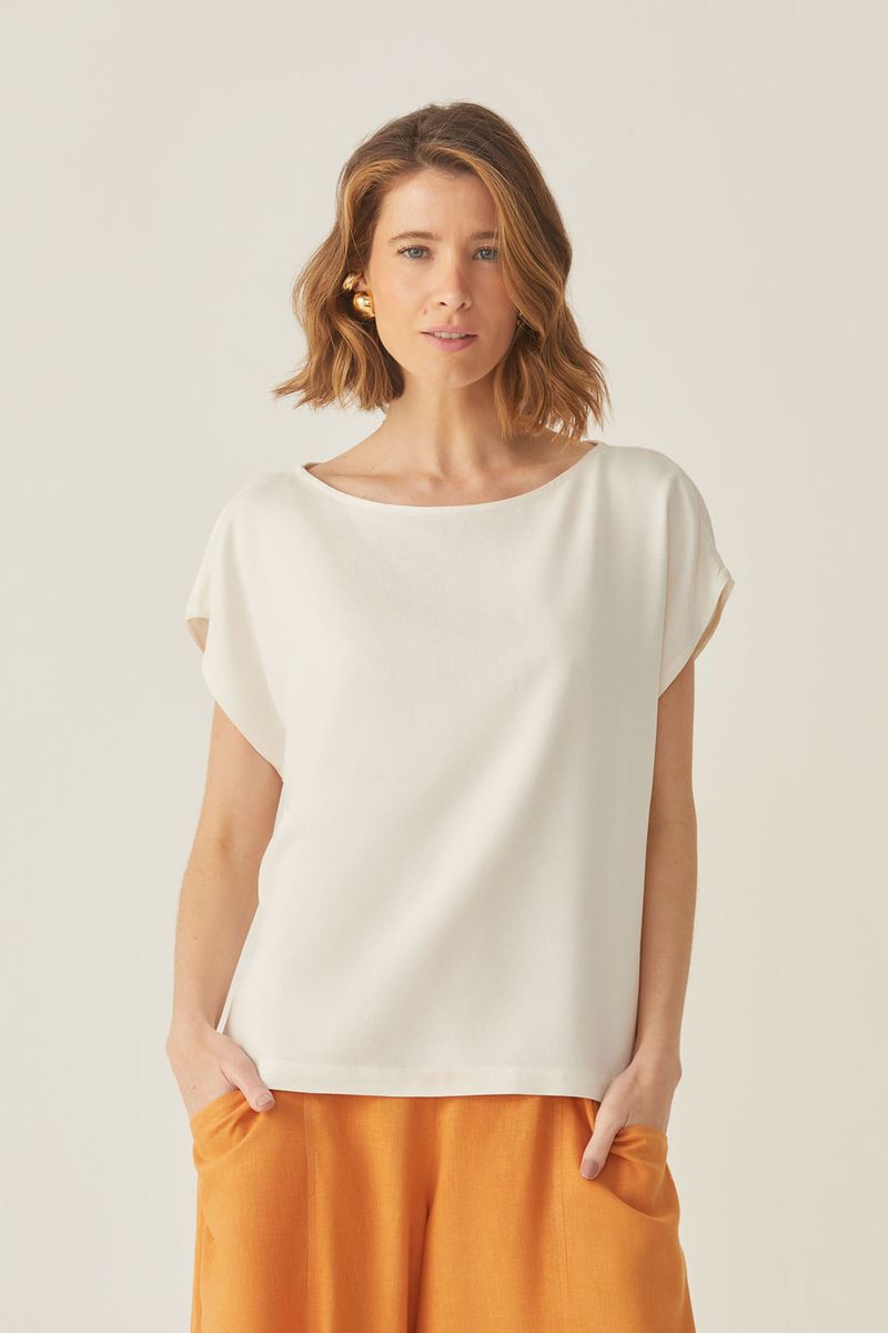 Blusa confeccionada em tecido plano. Ótimo caimento. Modelo levemente solto ao corpo. Decote canoa e mangas curtas. Aberturas laterais.