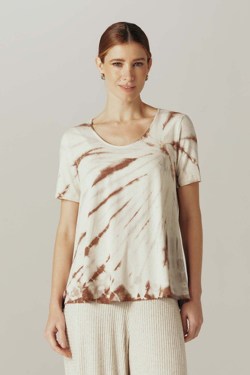Blusa confeccionada em malha de viscose com linho e elastano. Possui o toque macio e agradável da viscose, além da durabilidade e conforto da fibra de linho. Modelo solto ao corpo. Decote U, mangas curtas. Frente e mangas da peça malha lisa, e costas na malha canelada. Peça com tingimento manual tie dye.