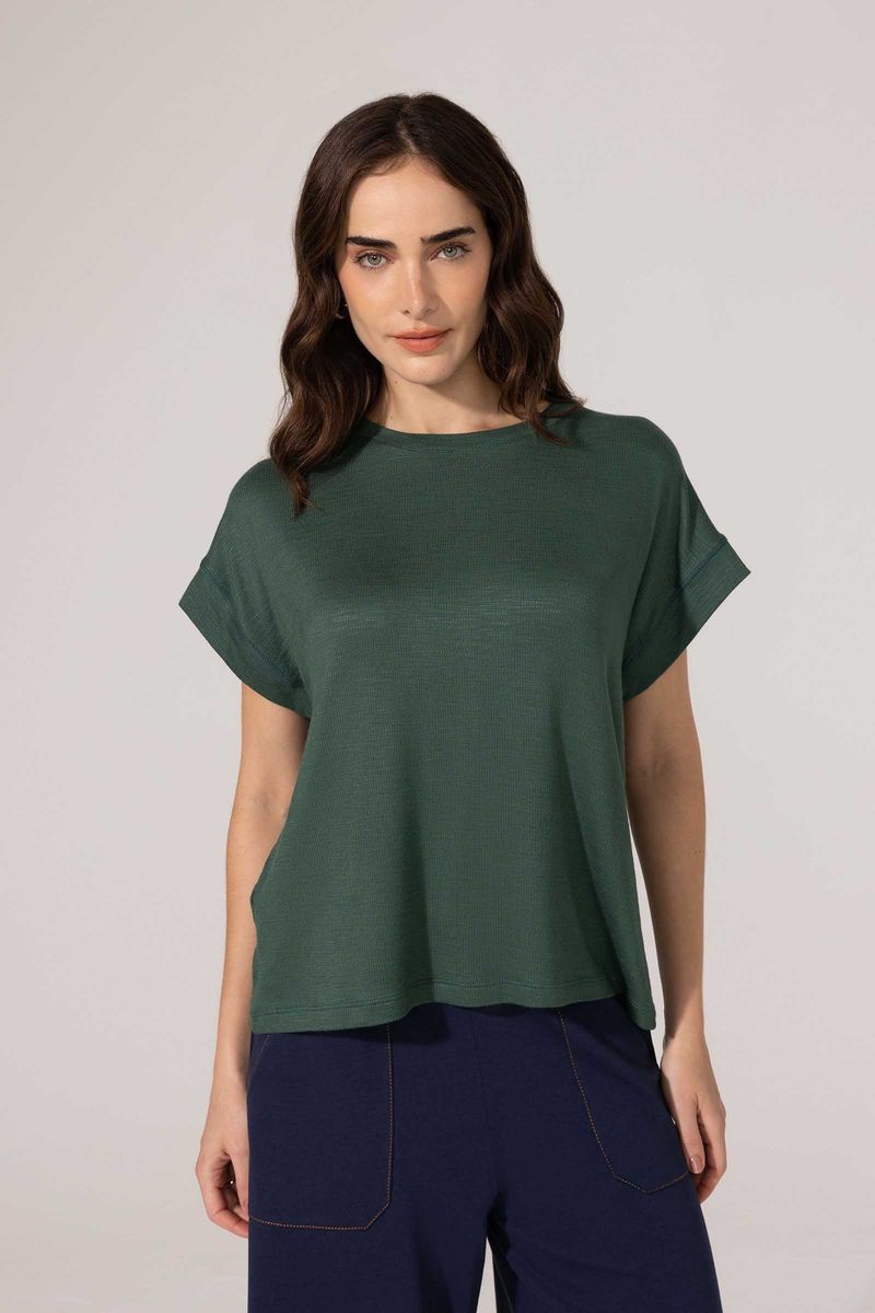 Blusa confeccionada em malha flamê de viscose com elastano. Leve, macio e confortável. Modelo solto ao corpo. Decote redondo, mangas curtas, com barra aplicada. Pala e recorte costas.