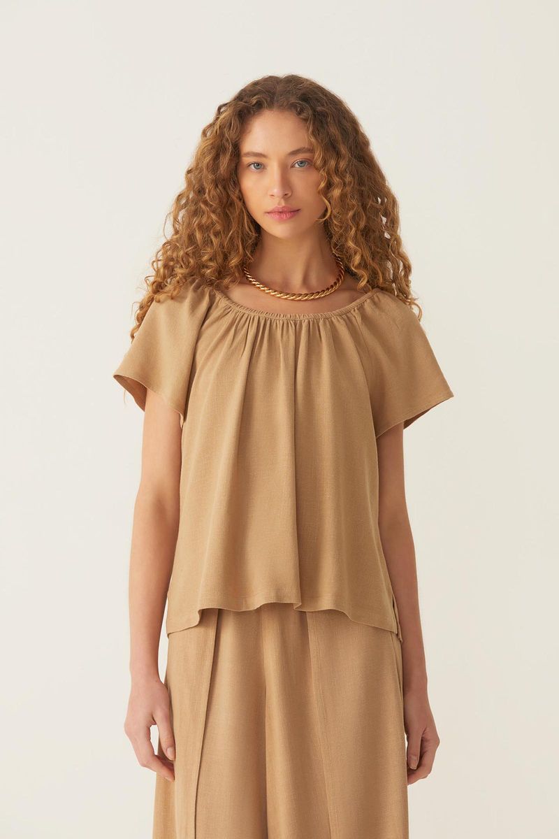 Blusa confeccionada em tecido plano de viscose com linho, proporcionando um toque agradável e ótimo caimento, além do aspecto natural do linho. Modelo solto ao corpo, com decote elástico embutido na frente e nas costas, criando um efeito franzido charmoso. Mangas curtas estilo raglan e aberturas laterais, conferindo versatilidade à peça. Pode ser usada também com o decote ombro a ombro para um visual mais descontraído.