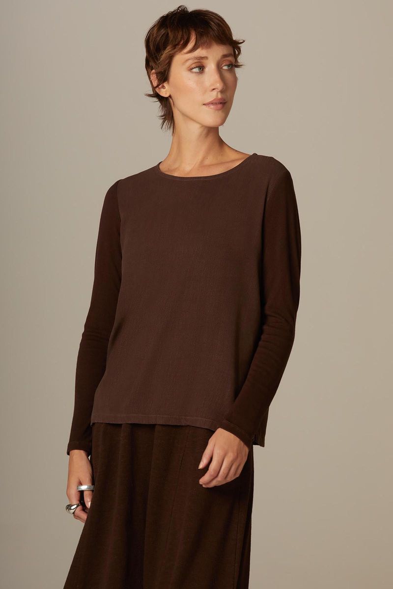 Blusa confeccionada em tecido plano, com mangas em malha canelada. Textura suave. Traz sofisticação, suavidade e ótimo caimento. Modelo solto ao corpo. Decote redondo e mangas longas. Aberturas laterais. Peça com tingimento manual estonado.