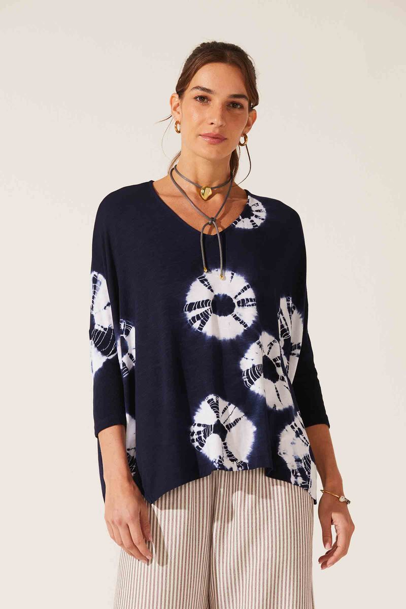 Blusa confeccionada em malha de viscose, modal e elastano. Esta mistura de fibras proporciona ótimo caimento, toque macio e agradável. Modelo amplo. Decote V, mangas 3/4 e cavas deslocadas. Aberturas laterais. Corpo da peça em malha lisa e mangas em malha canelada. Peça com tingimento manual.
