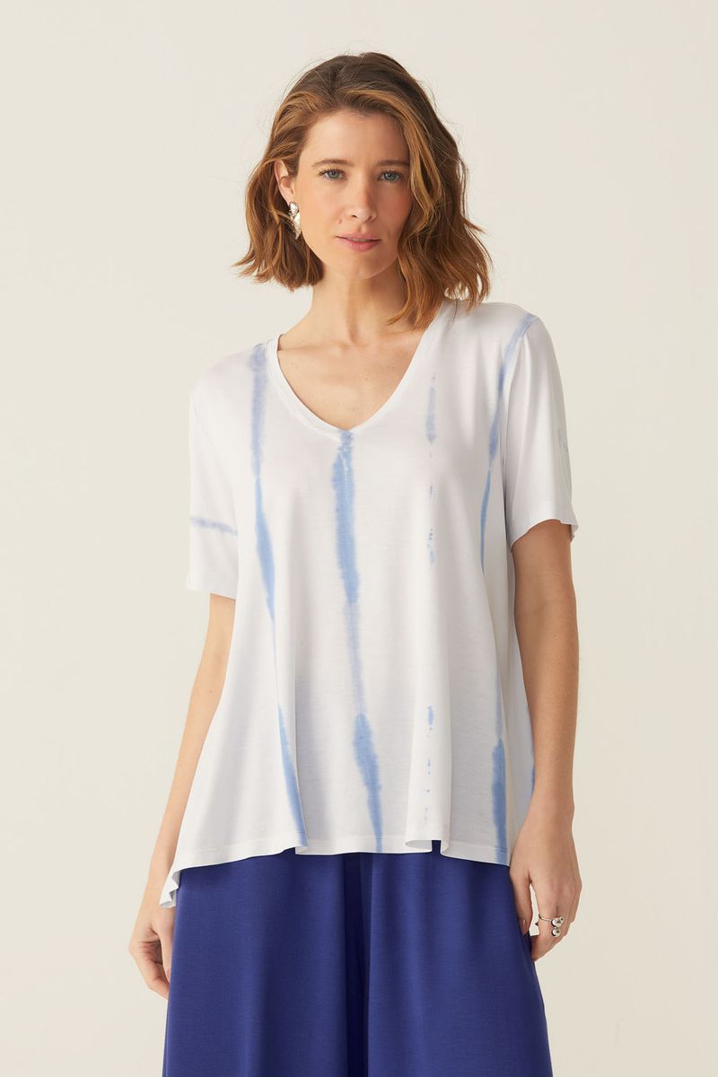 Blusa confeccionada em malha de modal com elastano. O modal tem toque agradável, macio e proporciona um ótimo caimento à peça. Modelo evase, com decote V e mangas curtas. Peça com tingimento manual, na técnica tie dye (amarrar e tingir), tornando cada peça única e exclusiva.