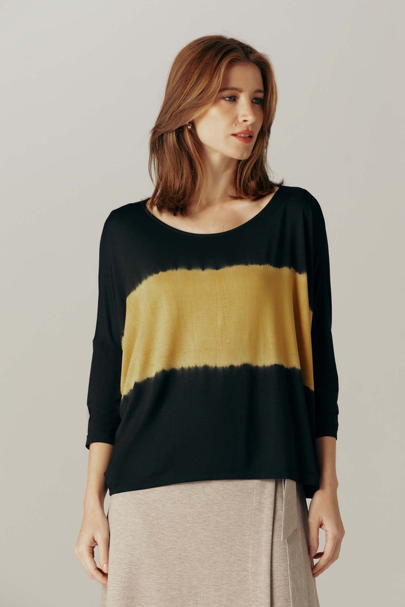Blusa confeccionada em malha de modal com elastano. O modal tem toque agradável, macio e proporciona um ótimo caimento à peça. Modelo amplo. Decote redondo, cavas deslocadas e mangas 3/4. Peça com tingimento manual. Cada peça é única e exclusiva.