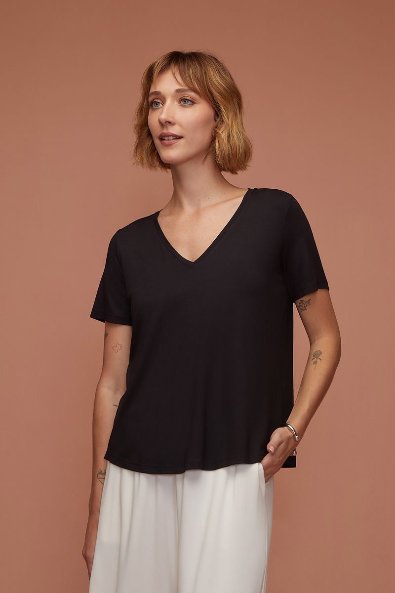 Roupa que respira, abraça, acolhe, refresca e aquece. Apresenta toque suave e delicado, respeitando a forma do seu corpo e unindo conforto com caimento. Modelo rente ao corpo, com decote V e mangas curtas.