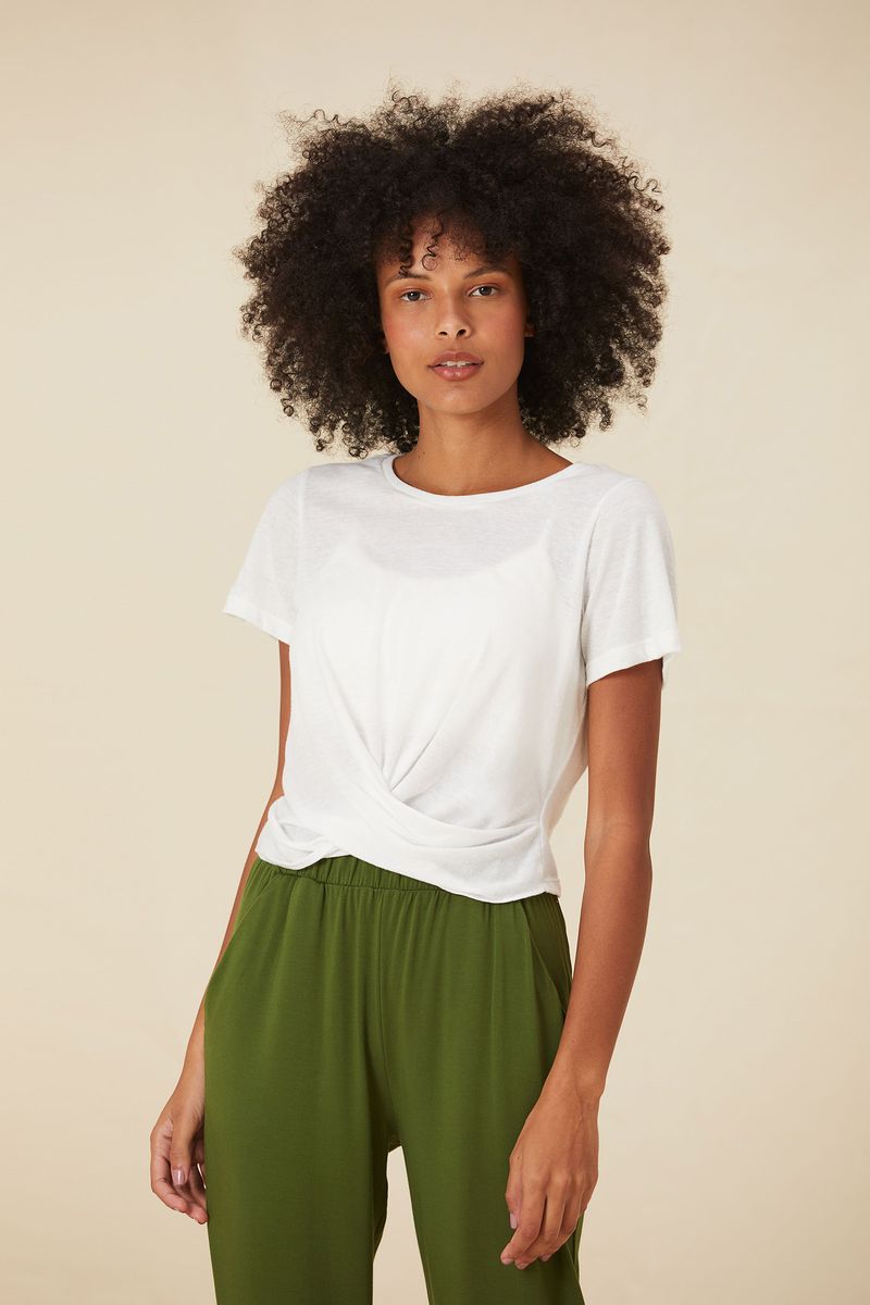 Blusa confeccionada confeccionado em malha reciclada. Este tecido sustentável utiliza matéria-prima que seria descartada, sem necessidade de água, corantes ou produtos químicos em sua produção. Modelo curto, com decote redondo e mangas curtas. Detalhe frontal com transpasse.