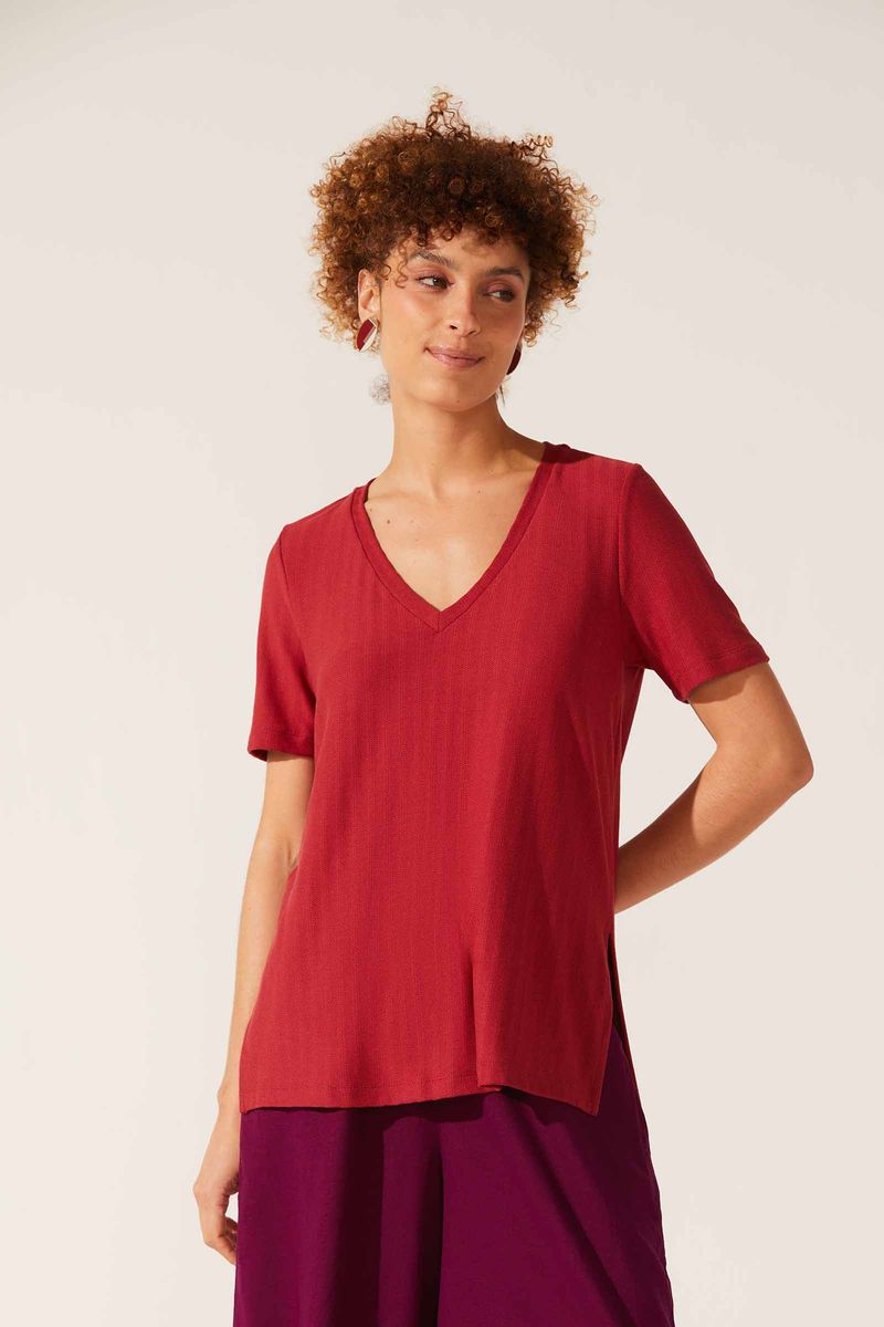 Blusa confeccionada em malha texturizada. Ótimo caimento, toque macio e agradável. Modelo alongado. Decote V, mangas curtas. Aberturas laterais e costas mais comprida que a frente.