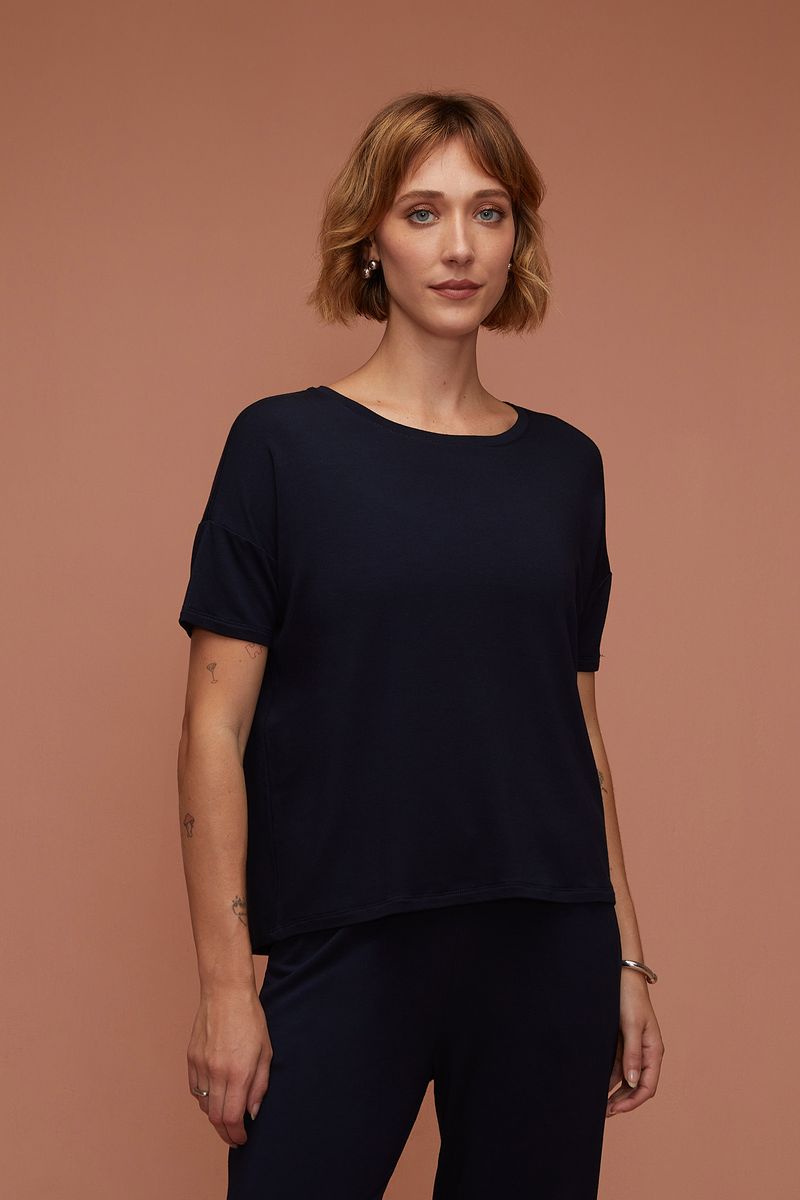 Roupa que respira, abraça, acolhe, refresca e aquece. Apresenta toque suave e delicado, respeitando a forma do seu corpo e unindo conforto com caimento. Modelo solto, com decote redondo e mangas curtas com cavas levemente deslocadas.