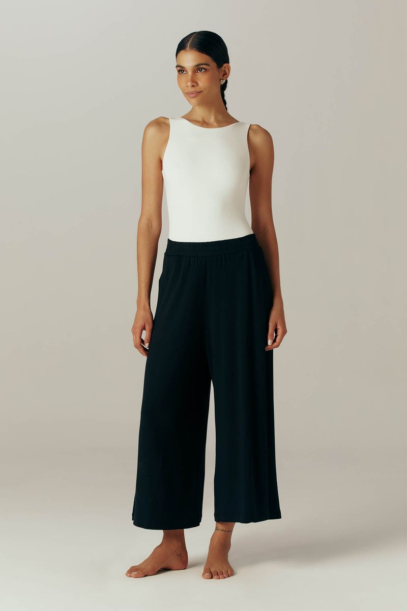 Calça confeccionada em viscose de Bambu, DNA da Yogini. Roupa que respira, abraça, acolhe, refresca e aquece. Apresenta toque suave e delicado, respeitando a forma do seu corpo e unindo conforto com caimento. Modelo pantacourt, com cós largo franzido e elástico, além de bolsos faca.