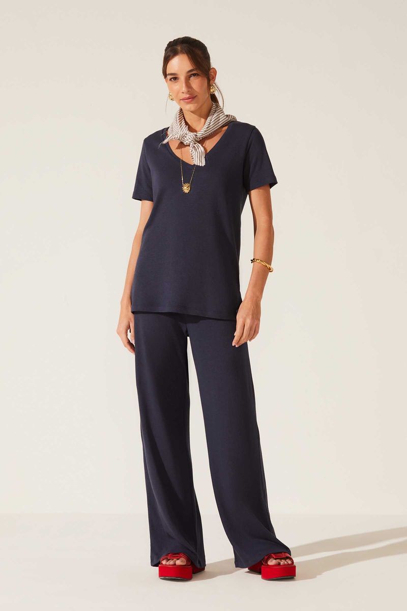 Calça confeccionada em malha de algodão, viscose e linho. Possui o conforto e maciez da fibra de algodão e a elegância do linho, além do ótimo caimento da viscose. Modelo wide leg. Cós alto e largo, em ribana, com elástico embutido, rebatido em "zig zag". Bolsos traseiros.