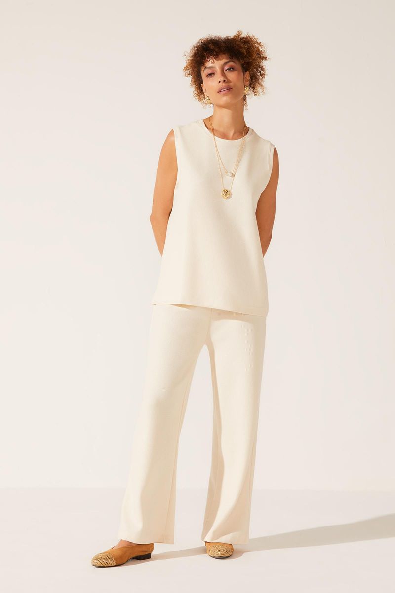 Calça confeccionada em malha 100% algodão texturizada. Tem como principais características a maciez, o toque suave e agradável da fibra natural. Modelo wide leg. Cós em ribana, com elástico embutido.