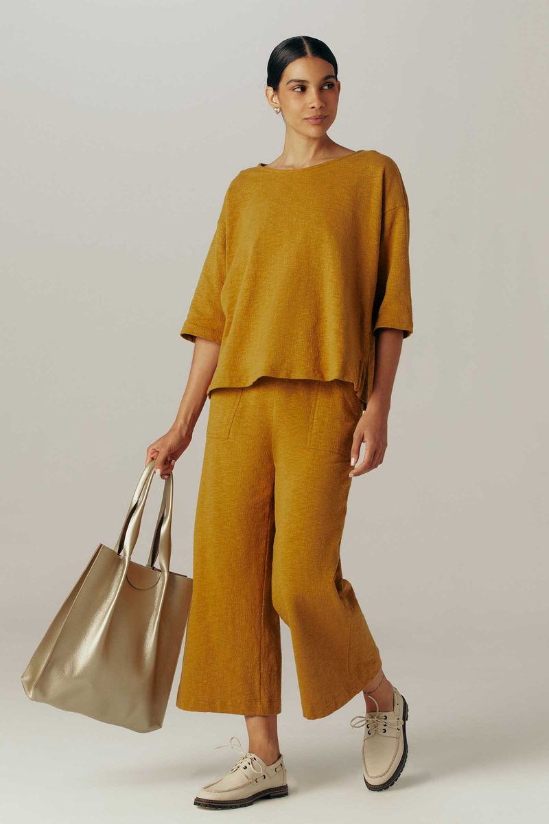 Calça confeccionada em malha texturizada, 100% algodão. Toque macio e agradável, oferecendo muito conforto. Modelo pantacourt. Cós com elástico embutido, levemente franzido. Bolsos aplicados, frente e costas. Barra larga.