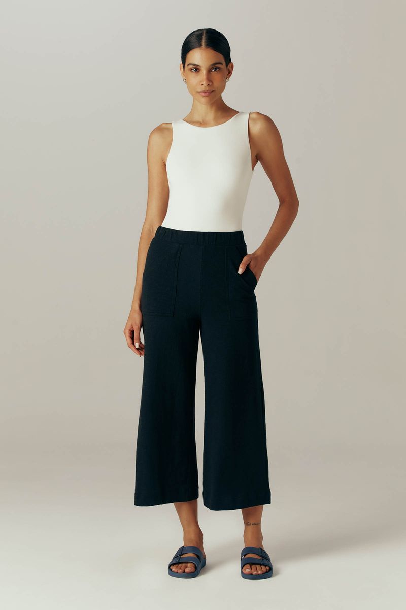Calça confeccionada em malha texturizada. Toque macio e agradável, oferecendo muito conforto. Modelo pantacourt, com cós com elástico embutido, levemente franzido. Bolsos aplicados na frente e nas costas, e barra larga.