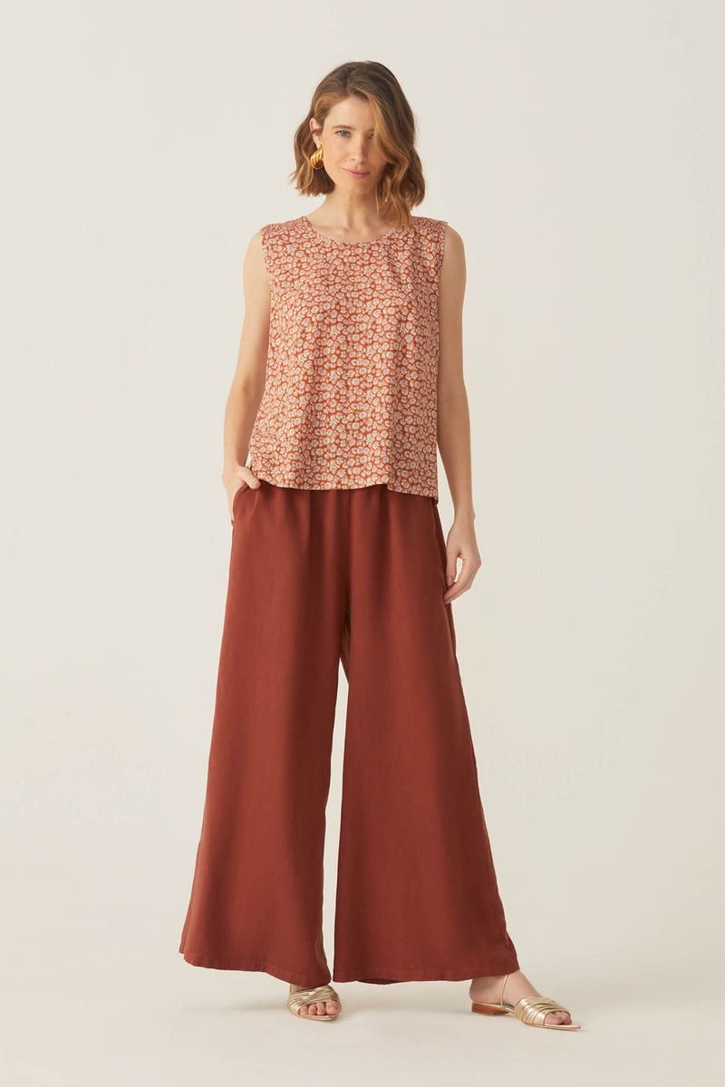 Calça confeccionada em tecido plano. Com toque agradável e ótimo caimento. Modelo pantalona. Cós largo com elástico embutido. Bolsos laterais e bolsos aplicados nas costas. Peça com tingimento uniforme.