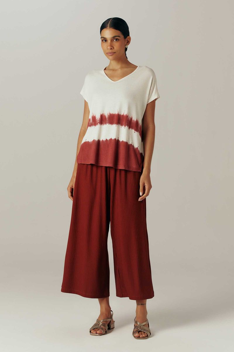 Calça confeccionada em malha canelada de viscose com elastano. É versátil, com toque macio e agradável. Modelo pantacourt. Cós com elástico embutido.