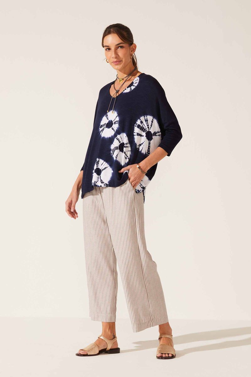 Calça confeccionada em tecido plano listrado 100% viscose. Leve e fluído. Modelo pantacourt. Cós com elástico embutido. Bolsos laterais. Corpo da peça com listras na vertical, detalhe dos bolsos na horizontal.