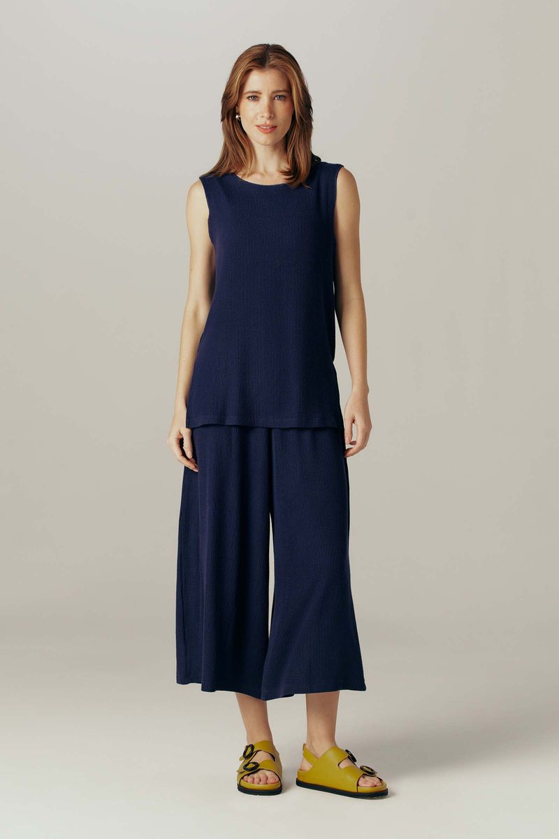 Calça confeccionada em malha canelada e texturizada de viscose com elastano, oferecendo frescor, fluidez e excelente caimento. Modelo pantacourt com cós de elástico embutido para maior conforto.