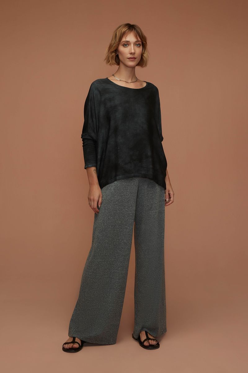 em malha reciclada. Este tecido sustentável utiliza matéria-prima que seria descartada, sem necessidade de água, corantes ou produtos químicos em sua produção. Modelo pantalona, com cós de elástico embutido, proporcionando conforto e leveza.