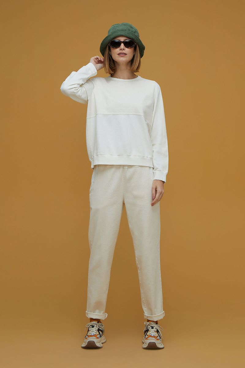 Calça confeccionada em sarja de algodão sustentável. Tecido macio, resistente e elegante. Modelo cenoura com cós em ribana, elástico embutido e cadarço de algodão com ponteira emborrachada. Bolsos aplicados nas costas e frontais em moletom 100% algodão.