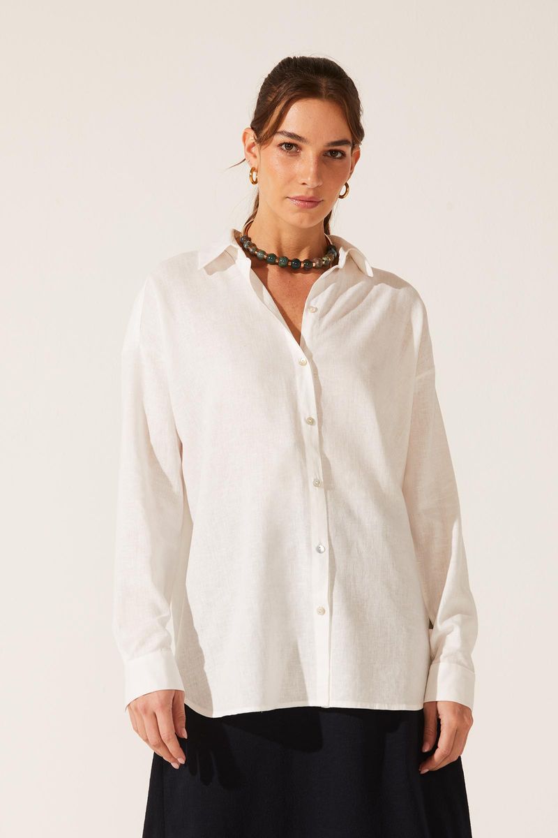 Camisa confeccionada em tecido plano de linho com viscose, que combina toque agradável e ótimo caimento com um ar rústico e fresco, característico da fibra natural. Modelo solto, com gola e fechamento em botões de madrepérola, pala e pregas nas costas, e barra arredondada. A peça possui tingimento uniforme, ideal para looks elegantes e despojados.