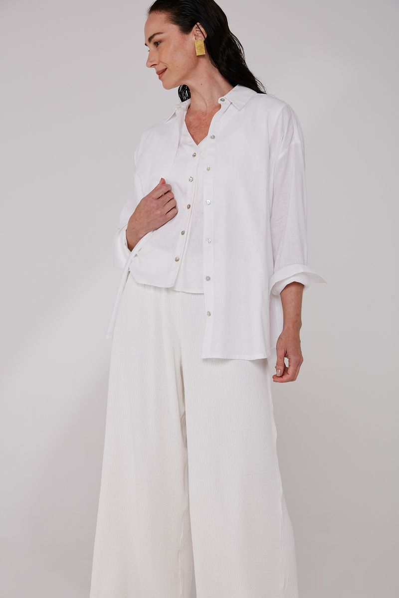Camisa confeccionada em tecido plano, de linho com viscose. Com toque agradável e ótimo caimento. Ar rústico e fresco, muito característico da fibra natural. Modelo solto. Gola e fechamento com botões de madrepérola. Pala e pregas nas costas. Barra arredondada. Peça com tingimento uniforme.