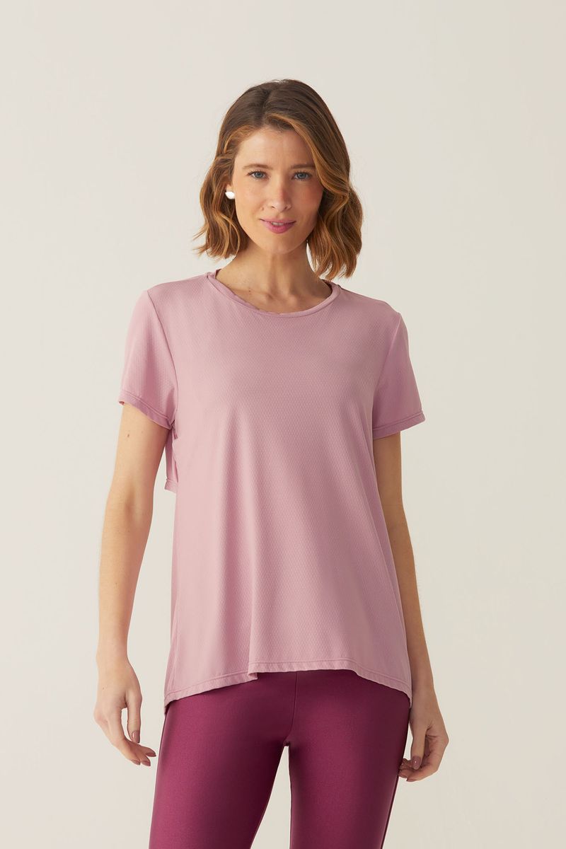 Camiseta com toque macio, suave e sensação gelada. Muito conforto e ótimo caimento. Com tecnologia DRY, mantém o corpo seco, e tecnologia antimicrobiana, que evita a proliferação de bactérias. Modelo solto ao corpo, com decote redondo e mangas curtas. Detalhe de abertura nas costas, com elástico dando efeito levemente franzido.