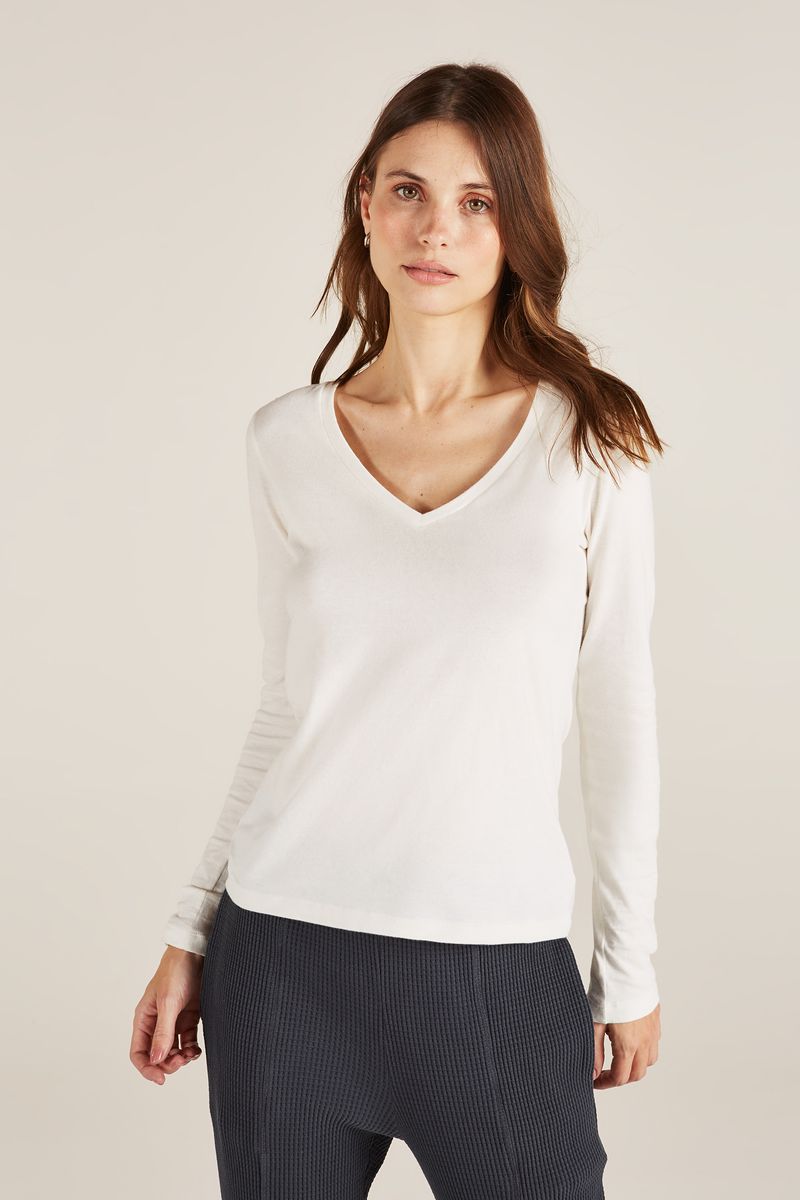 Blusa confeccionada em malha de algodão com elastano, unindo o conforto e a maciez da fibra natural com a elasticidade. Modelo justo ao corpo, com decote V e mangas longas, é uma peça básica e versátil para compor diferentes looks.