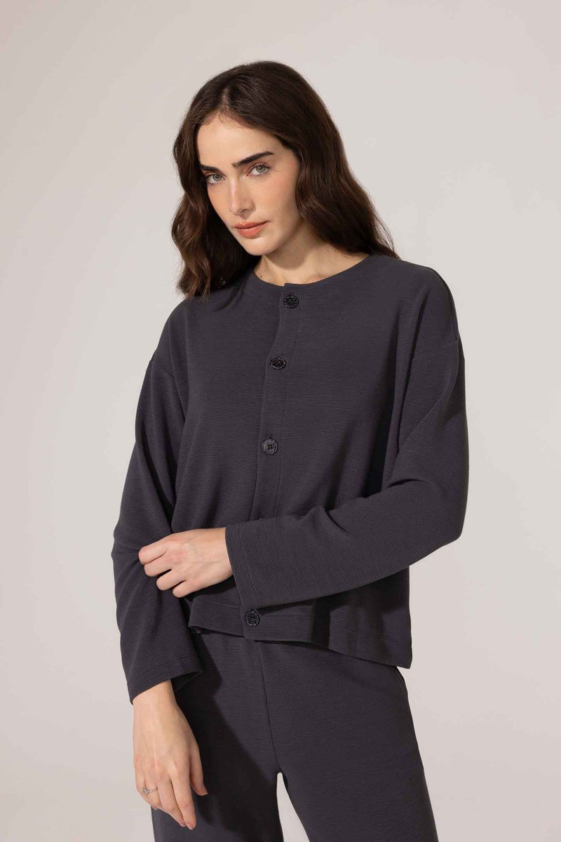 Casaco confeccionado em malha canelada de viscose com poliéster e elastano. É versátil, com toque macio e agradável. Modelo reto solto ao corpo, com canelado no sentido vertical. Fechamento com botões. Mangas longas, cavas deslocadas e pala nas costas.