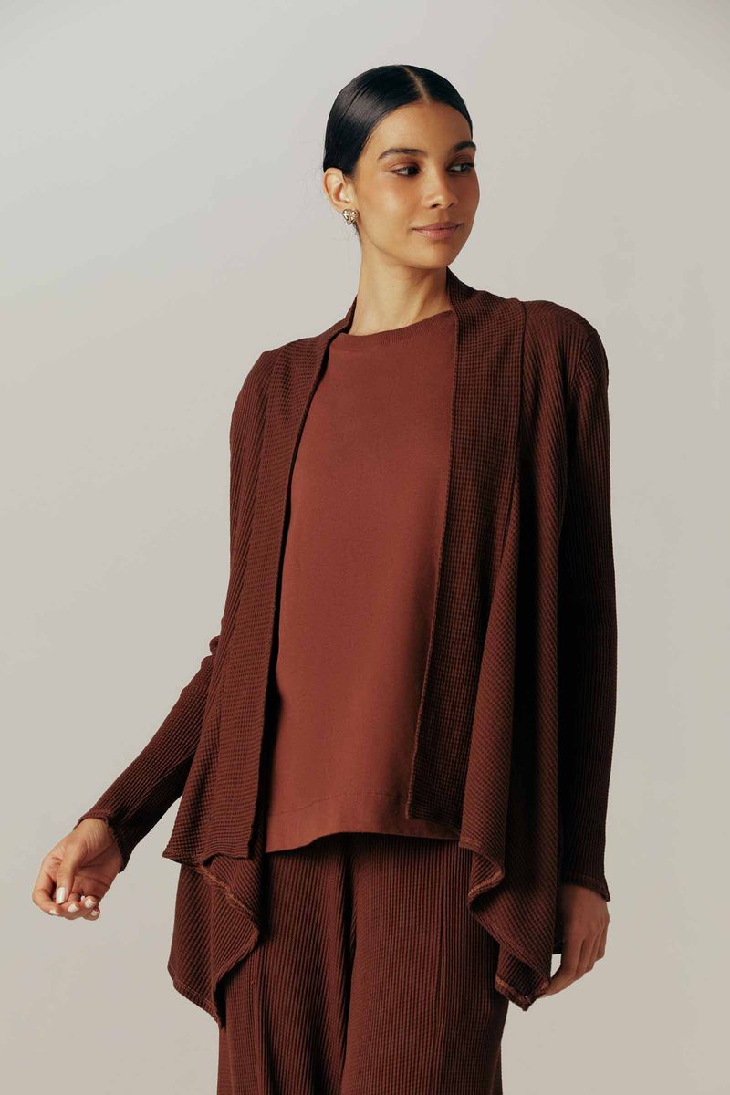 Casaco confeccionado em malha de viscose e elastano. Com textura quadriculada waffle. Macio, confortável e com toque agradável. Modelo alongado, com pontas nas laterais. Vista dupla do próprio tecido. Recortes nas costas.