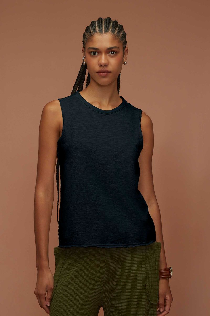 Regata confeccionada em malha texturizada, 100% algodão. Apresenta toque macio e agradável, oferecendo muito conforto. Modelo alongado, levemente solto ao corpo, com cavas mais baixas e decote redondo. O acabamento à fio nas cavas e barra adiciona um detalhe especial.