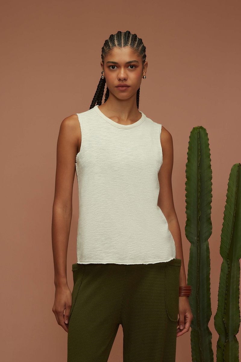 Regata confeccionada em malha texturizada. Apresenta toque macio e agradável, oferecendo muito conforto. Modelo alongado, levemente solto ao corpo, com cavas mais baixas e decote redondo. O acabamento à fio nas cavas e barra adiciona um detalhe especial.
