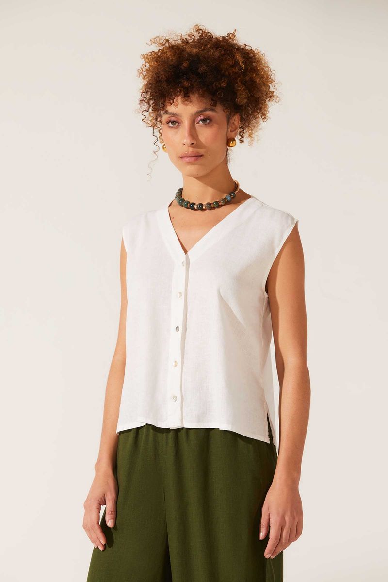 Regata confeccionada em tecido plano de linho com viscose. Toque agradável, ar rústico e fresco, muito característico da fibra natural. Modelo reto. Vista frontal com fechamento em botões madrepérola. Decote V e abertura lateral. Peça com tingimento uniforme.