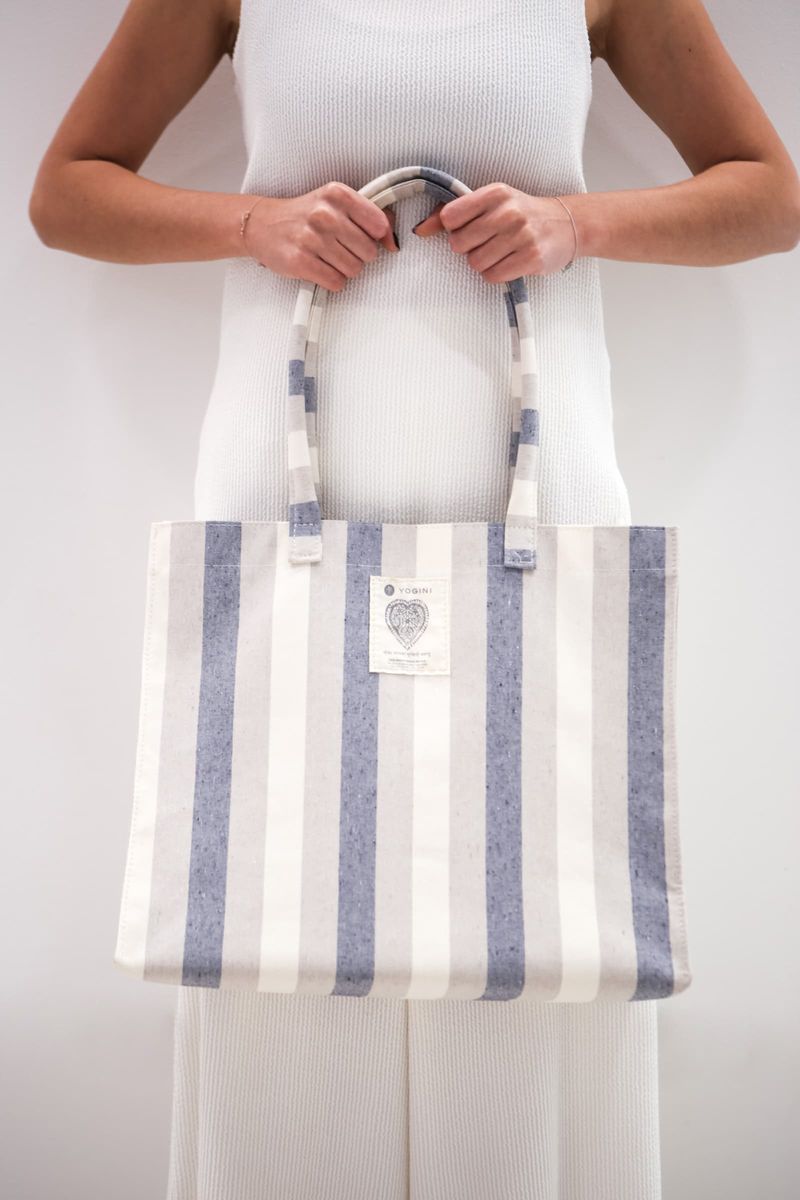 Tote Bag confeccionada em tecido sarjado listrado 100% algodão, com alças acolchoadas. Fundo feito em papelão, forrado com tecido sarjado 100% algodão liso. Espaçosa e versátil!