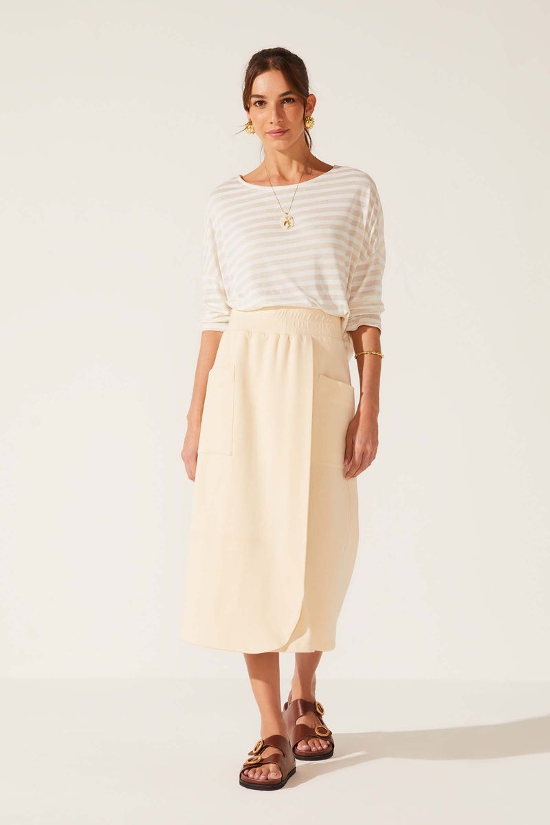 Saia confeccionada em malha texturizada algodão sustentável. Tem o conforto e a maciez da fibra natural. Tem reconhecimento internacional pelo selo BCI (Better Cotton Initiative). Modelo reto com comprimento midi. Cós largo em ribana com elástico embutido. Detalhe transpassando na frente e bolsos frontais.
