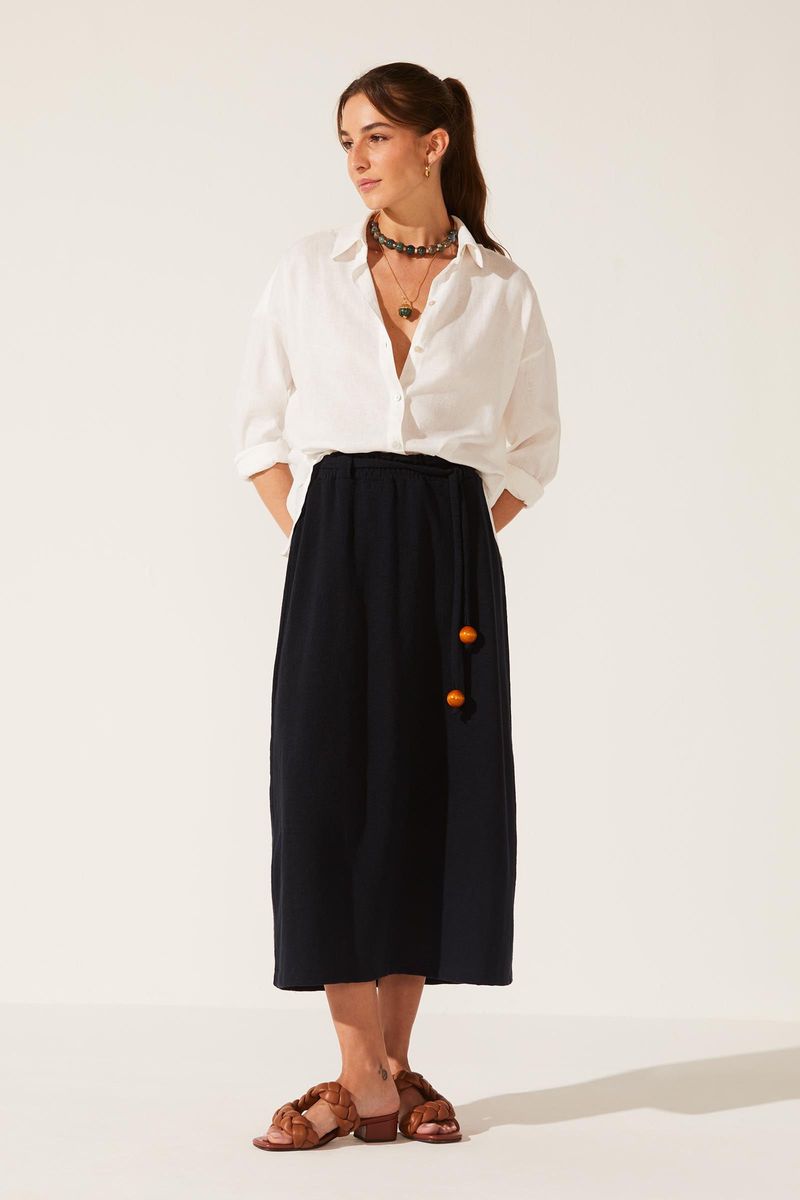 Saia confeccionada em malha texturizada, 100% algodão. Toque macio e agradável, oferecendo muito conforto. Modelo clochard, com comprimento midi. Cós com elástico embutido, com passantes. Acompanha faixa no próprio tecido, com ponteiras esféricas em madeira.