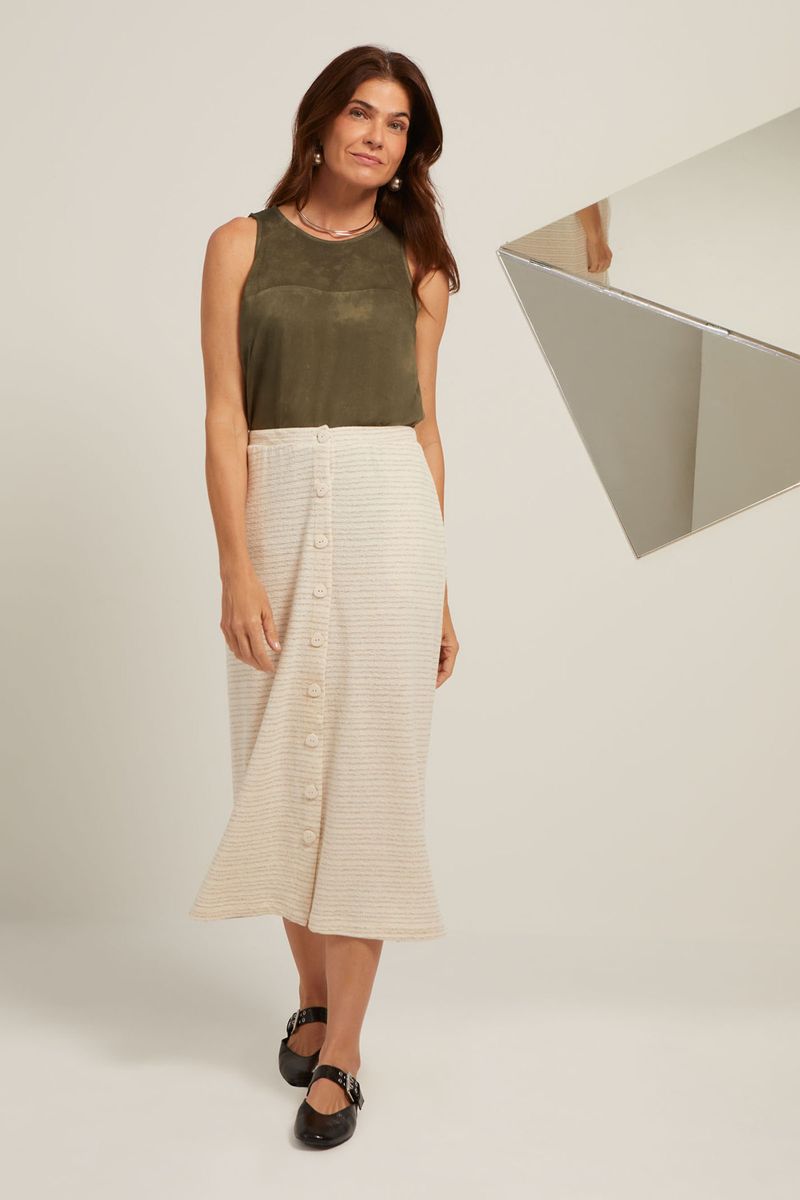 Saia confeccionada em malha listrada. Traz a resistência, elegância e versatilidade da fibra de algodão e do linho. Além do toque macio e ótimo caimento da viscose. Modelo evasê, com comprimento midi. Cós com elástico embutido, sem franzido. Vista frontal, com fechamento em botões em formato triangular. Bolsos laterais.