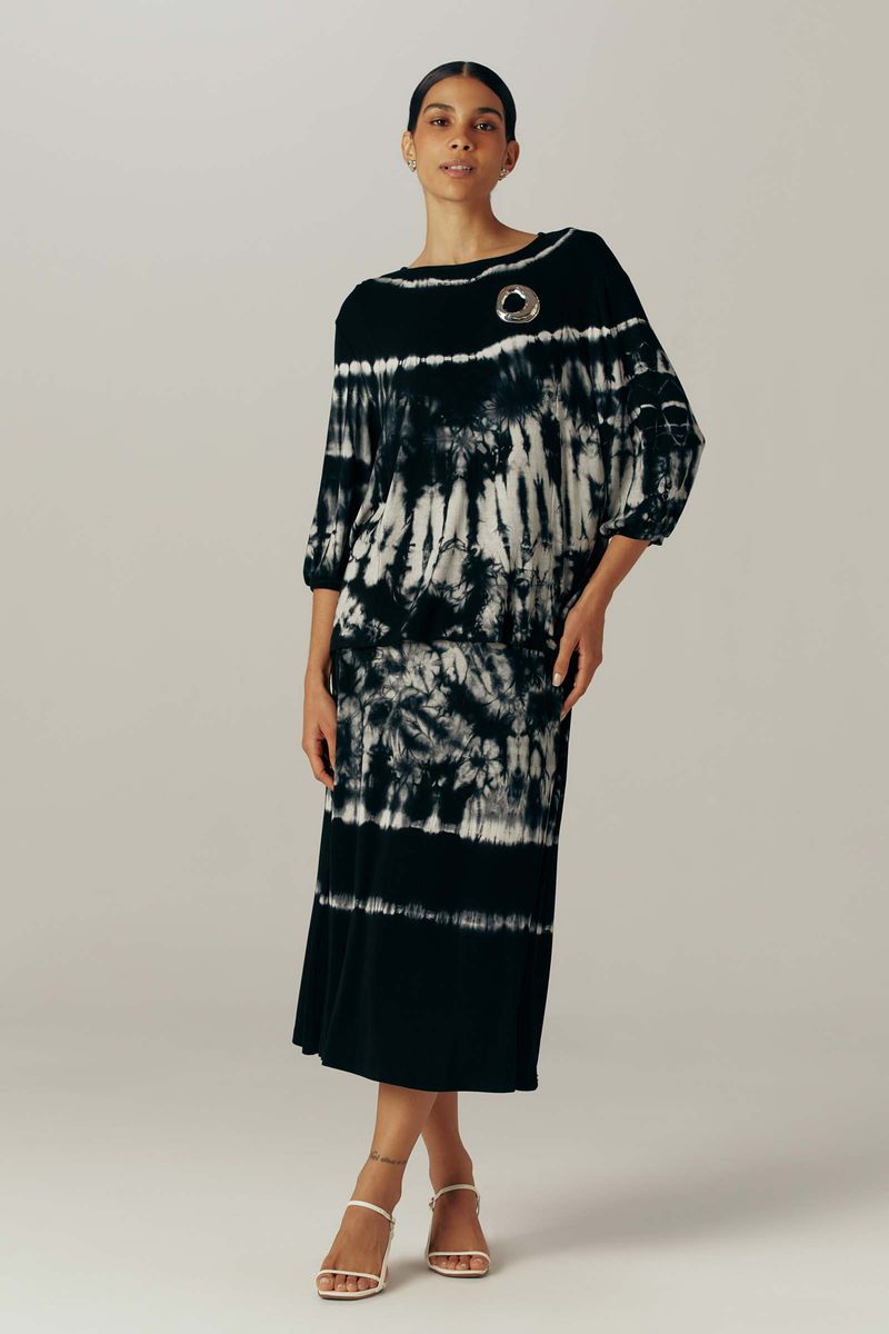 Saia confeccionada em malha de viscose e elastano. Com aspecto de tricot e toque macio e agradável, oferecendo muito conforto. Modelo evasê, com comprimento midi. Cós com elástico embutido e recorte no meio costas. Peça com tingimento manual tie dye.