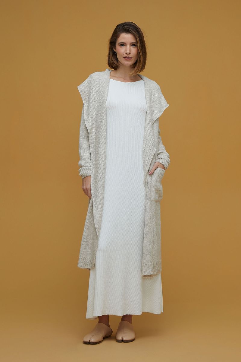 Tricot com toque extremamente macio, unindo elegância e conforto em uma peça feminina e versátil. Modelo longo com capuz, mangas longas e bolsos frontais, ideal para complementar looks casuais ou mais elaborados.