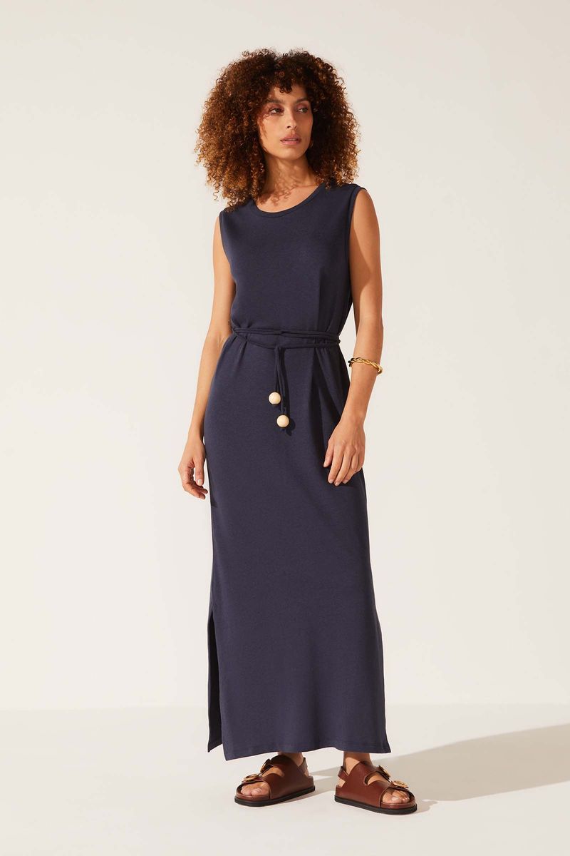 Vestido confeccionado em malha de algodão, viscose e linho. Possui o conforto e maciez da fibra de algodão e a elegância do linho, além do ótimo caimento da viscose. Modelo regata, com comprimento midi. Decote redondo e fendas laterais. Acompanha faixa no próprio tecido com ponteiras esféricas em madeira clara.
