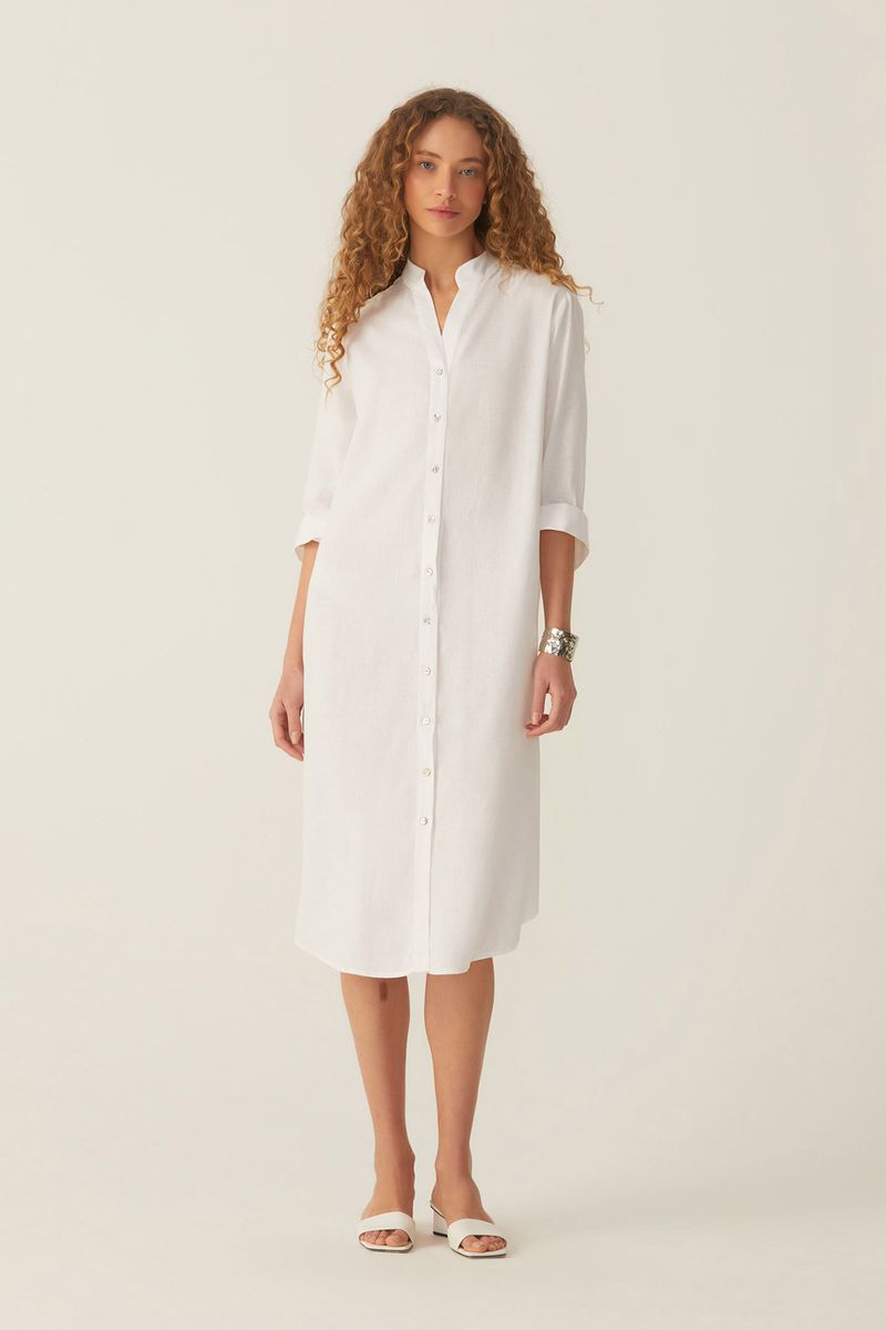 Vestido confeccionado em tecido plano de linho com viscose. A combinação das fibras naturais confere um ar rústico e fresco à peça. Modelo chemise amplo, com vista frontal e fechamento em botões madrepérola. Mangas longas e punhos com botões madrepérola. Abertura lateral, prega e pala nas costas.
