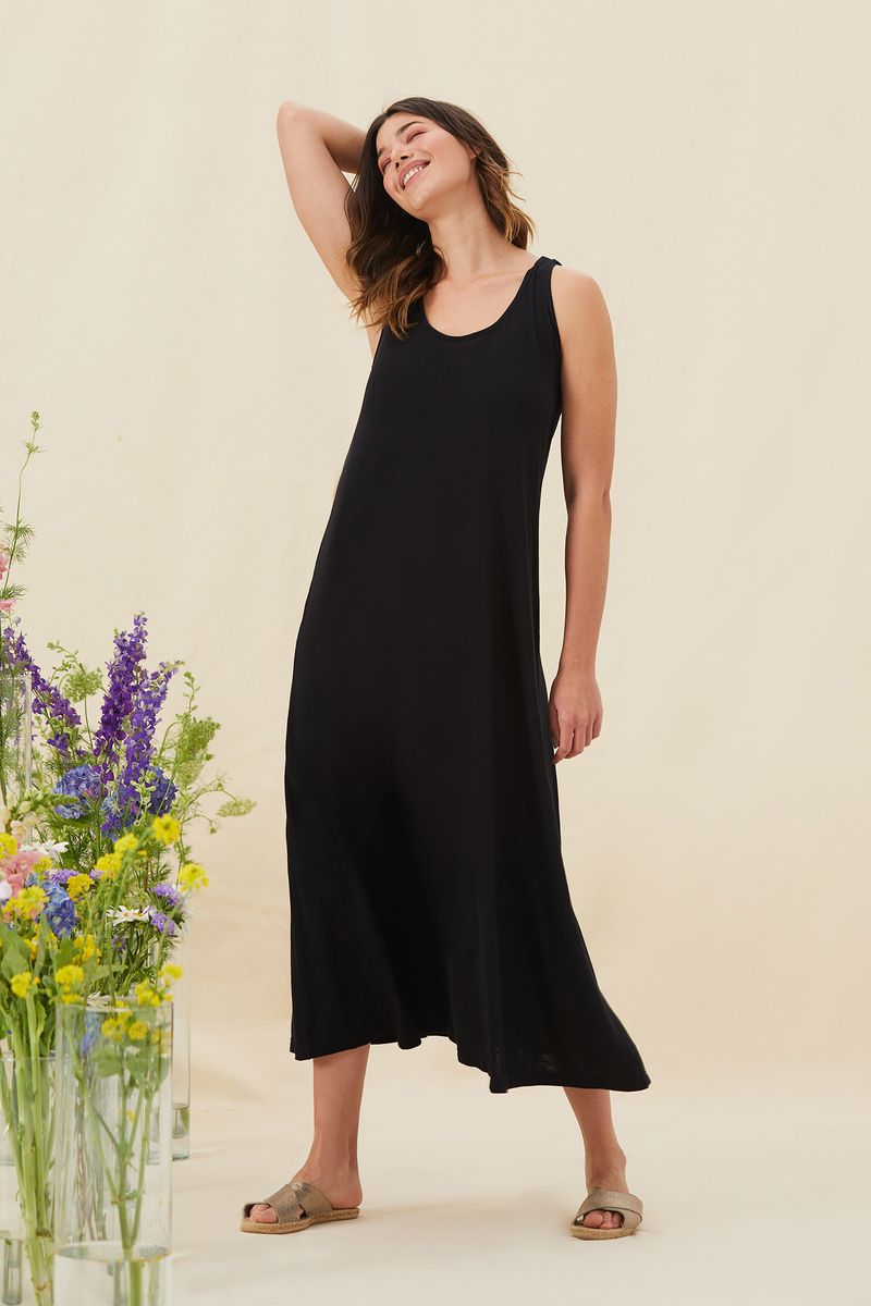 Vestido confeccionado em malha 100% algodão flamê. Oferece o conforto e a maciez da fibra natural. Modelo regata nadador, evasê longo, com decote U.